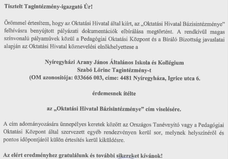 a Szabó Lőrinc Iskola az Oktatási Hivataltól elnyerte az